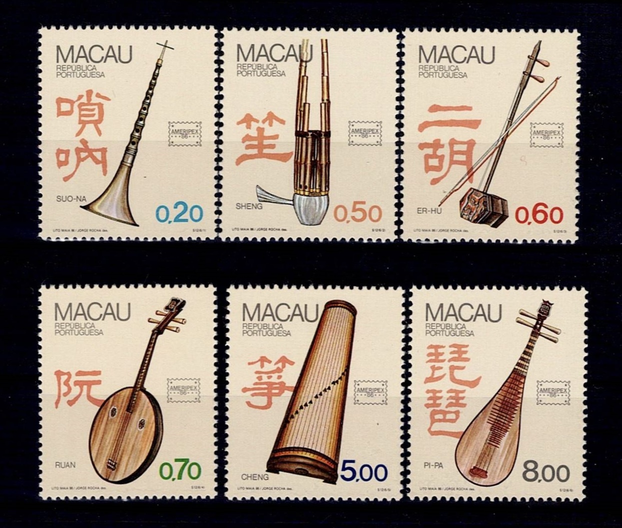 2007 imageMacao 1986 Regional Musical Instruments. Complete series Mf#526-531, polychrome, on enamel paper, perforation 13.5. New stamps with gum and without hinge. Catalogue value €60.(Image 1)