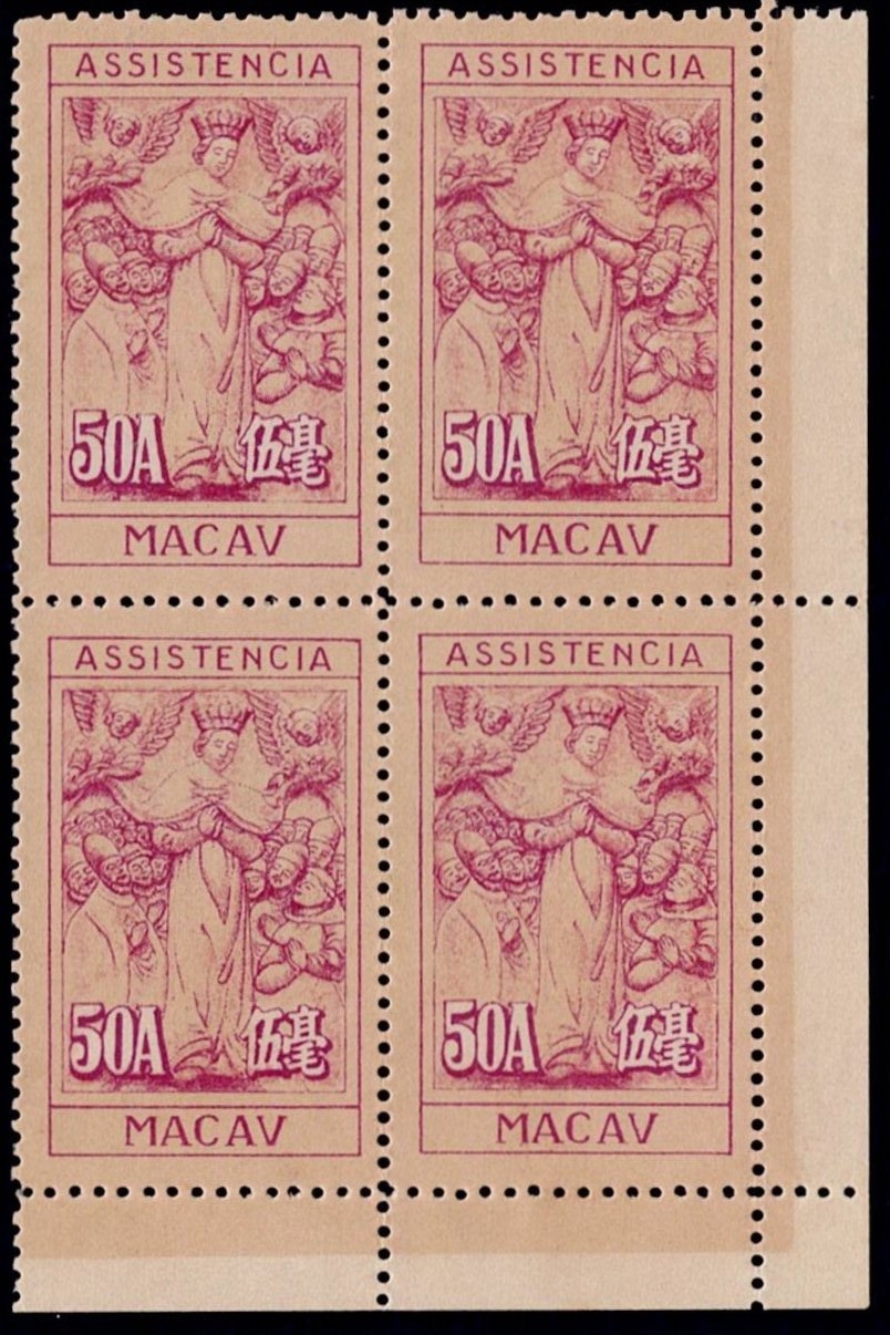 2009 imageMacao 1945-47 Postage Tax, Our Lady of Mercy. Corner block of stamp sheet Mf#12a, perforation 12 (Macao 1947), 50 lilac avos, smooth paper. Block of new stamps, ungummed as issued, without defects or repairs and in good color. Catalogue value €320.(Image 1)