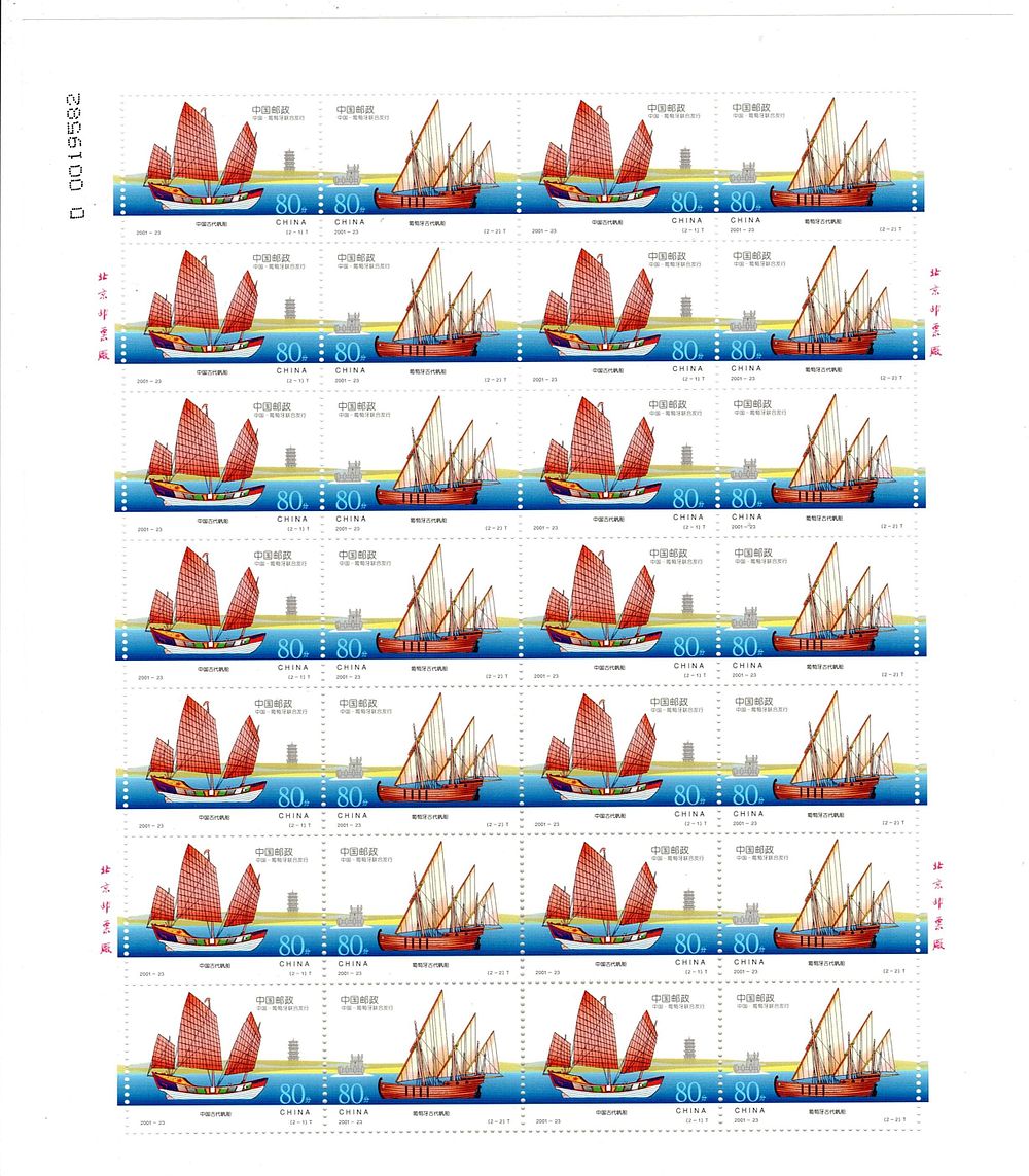 2010 imageChina 2001 Boats. Full sheet of 28 stamps, 2 different designs, Mi#3291-3292, Scott#3146, Yt#3943-3944, SG#3688a. New stamps, from the joint issue with Portugal, with original gum and without hinge, with a slight fold in the upper right corner without affecting the stamps, with very good color. Good.(Image 1)