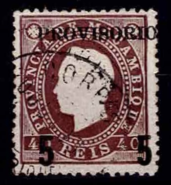 2014 imageMozambique 1893 D. Luis straight ribbon with surcharge. Stamp Mf#27b, 5 reis s/ 40 reis, red brown, with type 4 surcharge in black. Used copy, with good color and relief. Catalogue value €450.(Image 1)
