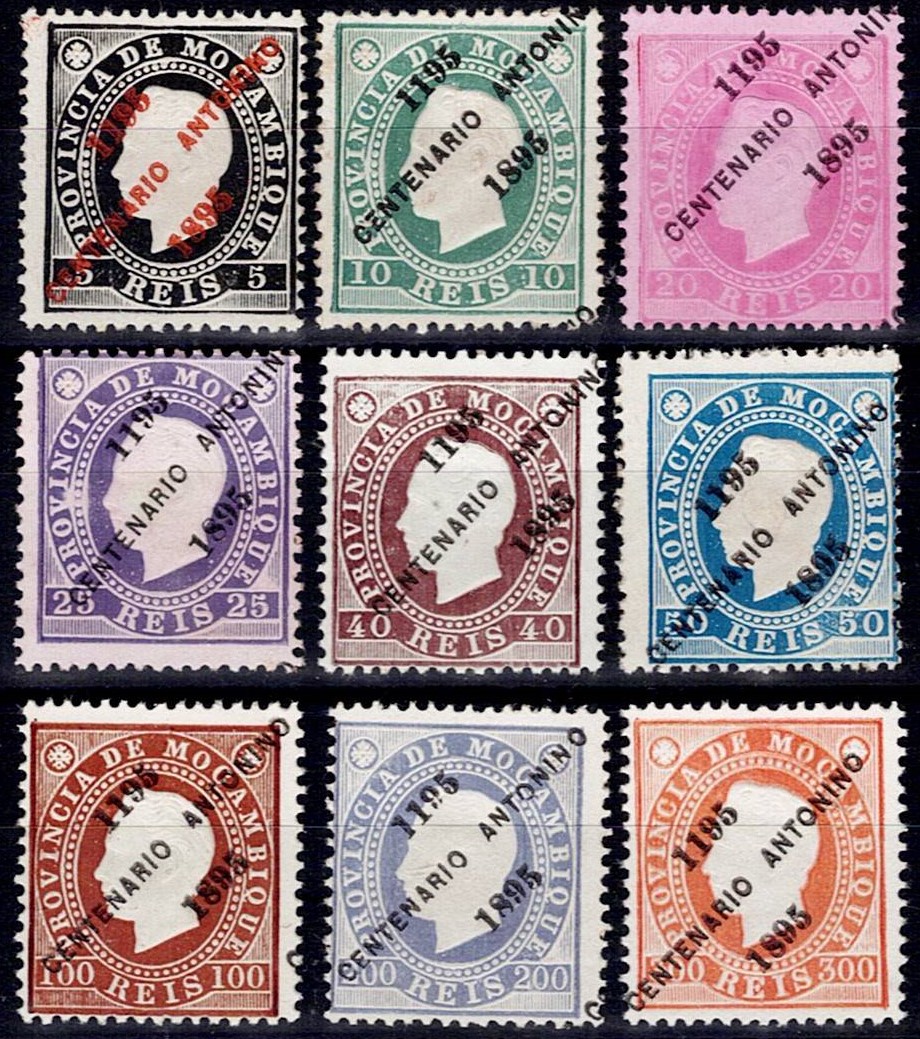 2016 imageMozambique 1895 D. Luis with overprint Centenary Birth of St. Anthony. Complete series of stamps Mf#41-49, porcelain paper, ungummed as issued. New stamps, with good relief and color, without defects or repairs. Catalogue value €316.(Image 1)