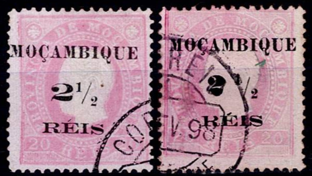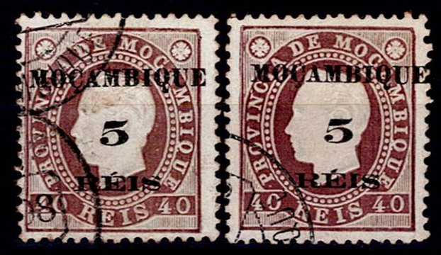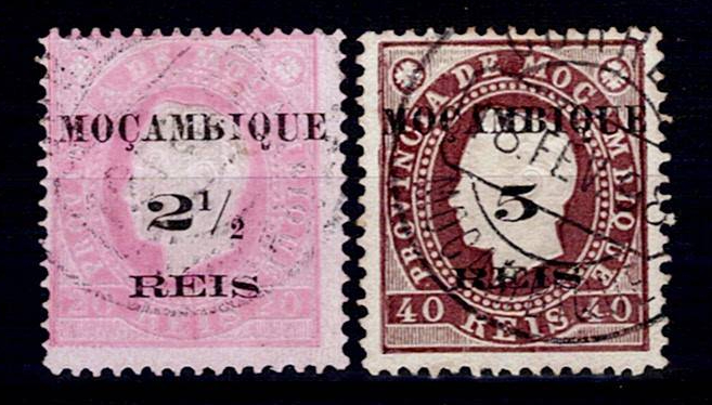 2017 imageMozambique 1897 - D. Luis straight label with surcharge. Set of 2 stamps Mf#51+51c, 2 different surcharges, porcelain paper, perforated 12.5 on used stamps. Catalog value €170.(Image 1)