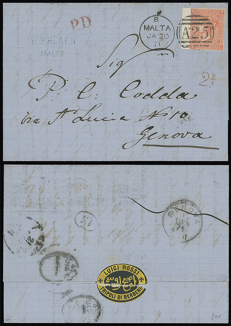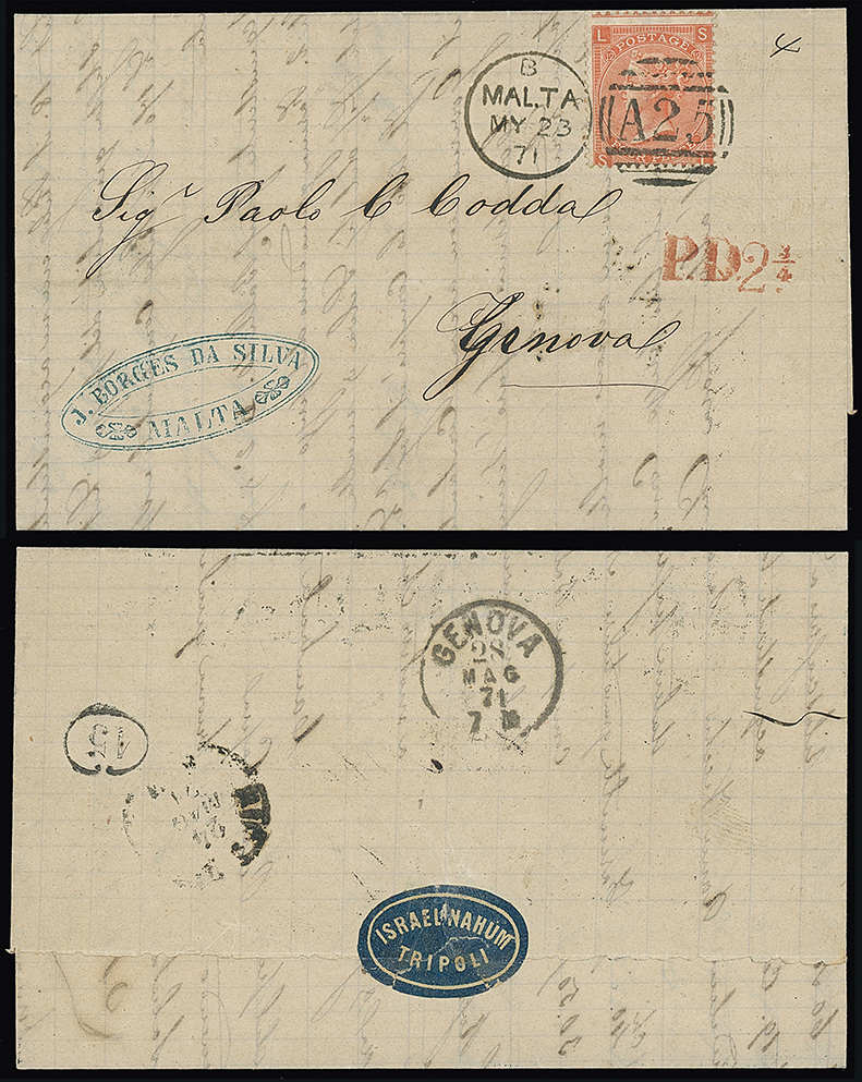 183 c, entire, etc. imageMalta: Forwarding Agents: 1871 (May 19) entire letter to Genoa from Tripoli with sender’s oval wafer seal on the reverse and privately carried to Malta where oval “J.BORGES DA SILVA/MALTA” forwarding agents cachet applied and franked 4d. plate 12 tied by “A25” duplex. Red “P.D.” and “23/4” accountancy marks below and the reverse with Messina and Genoa arrival c.d.s. Photo. (Image1)