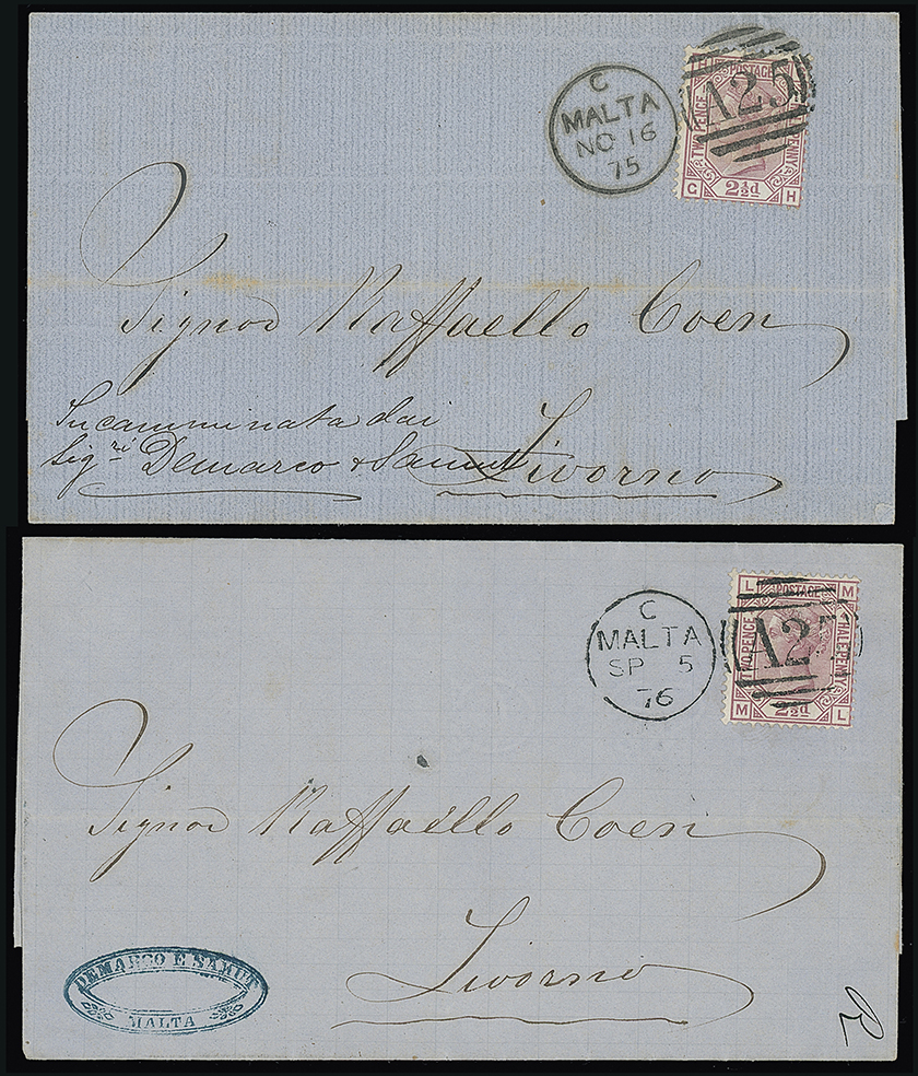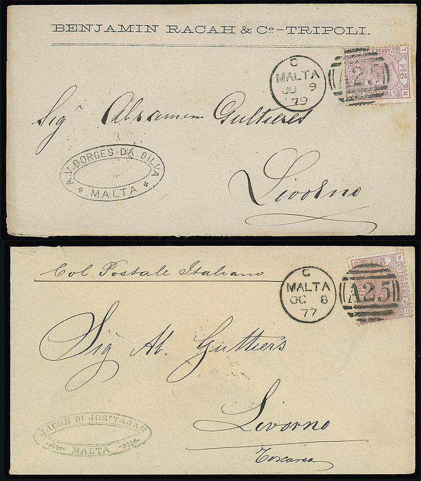 185 c, entire, etc. imageMalta: Forwarding Agents: 1877 (Oct. 5) and 1879 (June 6) envelopes to Livorno, both from Tripoli with “JACOB DI JOSE TAJAR/MALTA” or “A.V.BORGES DA SILVA/MALTA” forwarding agents’ cachets and franked 21/2d. plates 8 or 14 tied by “A25” duplex. Syracuse and Livorno datestamps on the reverse. (2 items) Very late examples of forwarded mail, largely made obsolete by formation of the G.P.U. Photo. (Image1)