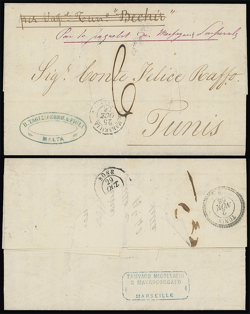 181 c, entire, etc. imageMalta: Forwarding Agents: 1866 (Oct. 13) disinfected slit entire letter to Tunis with oval cachet of “B.TAGLIAFERRO & FIGLI/MALTA” endorsed “per Vape Tuna. Bechir” deleted and re-endorsed “Par le paquebot Messageries Imperiales” and sent to Marseille where framed “TAMVACO MICRULACHI & MAVROGORDATO/MARSEILLE” forwarding agents’ cachet applied to the reverse, also with Bone, Algeria transit and Tunis arrival c.d.s. and rated “6” (décimes). Photo. (Image1)