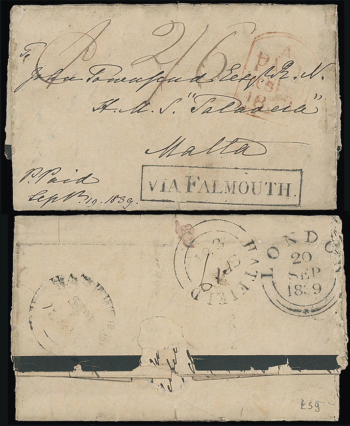 186 c, entire, etc. imageMalta: Maritime Mail: 1839 (Sept. 18) entire mourning letter “P Paid” to H.M.S “Talavera” at Malta with London Paid tombstone datestamp, very scarce framed “VIA FALMOUTH” mark (in use 1838-40), rated “2/6”(d) carried on the “Iberia” to Gibraltar and the “Phoenix” to Malta. Ex Harper. Photo. (Image1)