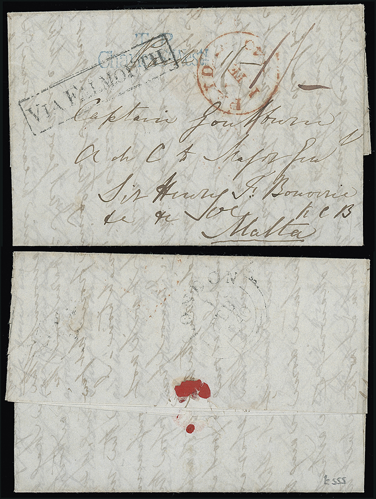 187 c, entire, etc. imageMalta: Maritime Mail: 1840 (Jan. 30) entire letter to the Governor of Malta with “T.P./Charles Street” in blue, London Paid c.d.s. and very scarce framed “VIA FALMOUTH” mark (in use 1838-40), rated “1/-”(d) carried on the “Emerald Isle” to Gibraltar and the “Acheron” to Malta, very fine. Photo. (Image1)