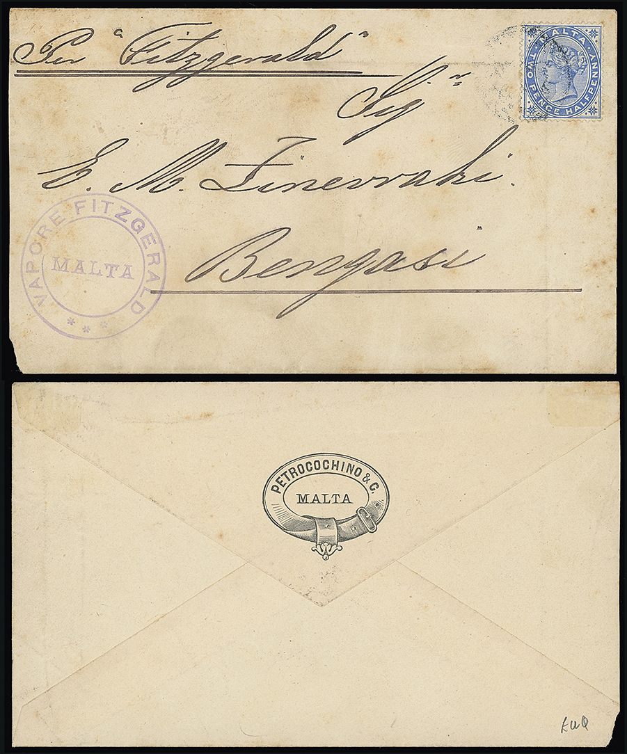 192 c, entire, etc. imageMalta: Maritime Mail: 1890 (ca) envelope “per Fitzgerald” to Benghazi franked 1885 21/2d. tied by violet seal of the Turkish P.O. in Benghazi on arrival and with double ring “VAPORE FITZGERALD/MALTA” cachet at left. Photo. (Image1)