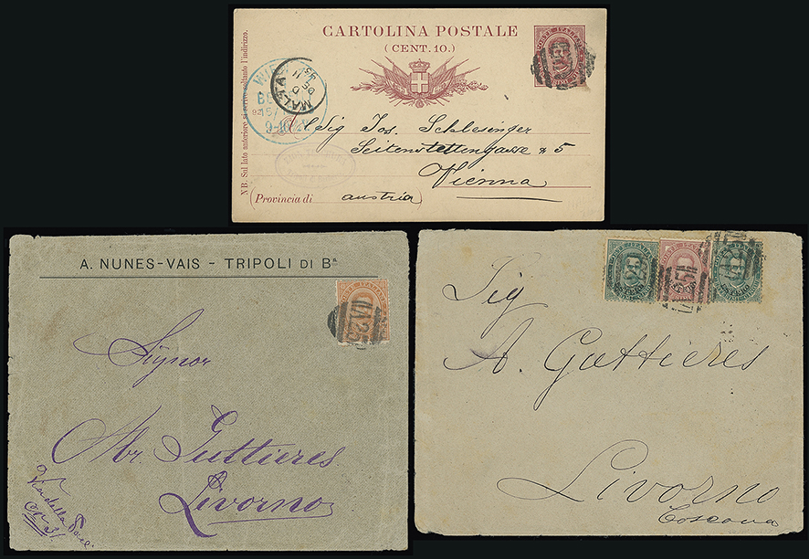 191 c, entire, etc. imageMalta: Maritime Mail: 1889 (July) envelope to Livorno franked Italian Levant 1881-83 5c. (2) and 10c. tied by upright oval “A25” bar cancellations in transit and posted on board a ship from Tripoli and the reverse with Malta, Naples and Livorno datestamps, 1891 (May) similar cover franked Italy 1879-82 20c. tied in transit by upright oval “A25” cancellation and 1893 (Dec. 11) Italy 10c. postcard to Vienna also from Tripoli and with Malta c.d.s. and upright oval bar “A25” cancellation. The last ex Coates. (3 items) (Image1)