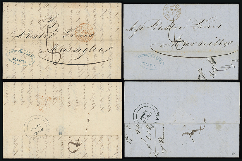 188 c, entire, etc. imageMalta: Maritime Mail: 1853 (Apr. 21) and 1854 (Oct. 30) entire letters to Marseille with Maltese datestamps on reverse, rated “8” décimes and with “GRECE I /MARSEILLE” or “D-SICILES/MARSEILLE” Packet Letter c.d.s., fine. (2 items) (Image1)