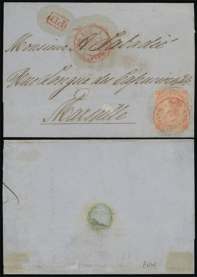 190 c, entire, etc. imageMalta: Maritime Mail: 1865 (Oct. 23) entire letter to Marseille franked 1865 4d. plate 7 cancelled on arrival and tied by “POSS.ANG.I./MARSEILLE” c.d.s. twice in red with additional strike at top and a framed “PD” mark also in red, highly unusual. Ex Bollen Photo. (Image1)