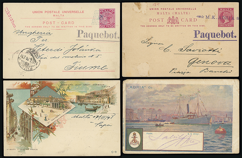 197 c, entire, etc. imageMalta: Maritime Mail: Adria Line: 1898 (Apr. 14) 1d. postcard to Genoa and 1898 (Dec. 17) picture postcard to Fiume franked 1d. both with underlined “Paquebot.” (blue or grey) marks and cancelled with “M.K.ADRIA” or anchor in dotted rhomboid, fine. (Image1)
