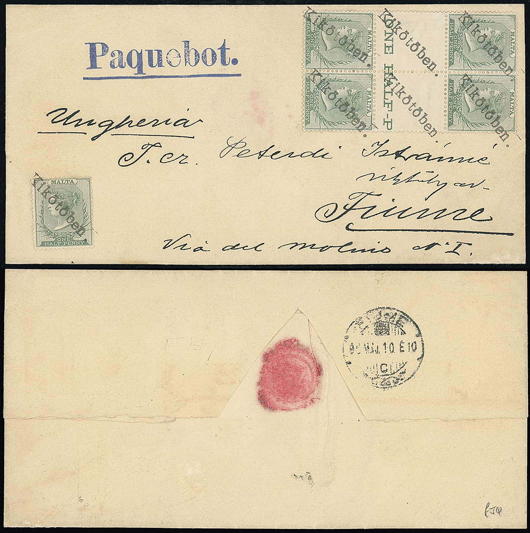 198 c, entire, etc. imageMalta: Maritime Mail: Adria Line: 1899 (May 10) wrapper to Fiume franked 1/2d. interpanneau block of four, scarce thus and single tied by “Kikötöben” (ship’s name) with blue underlined “Paquebot” mark, unusual. Photo. (Image1)