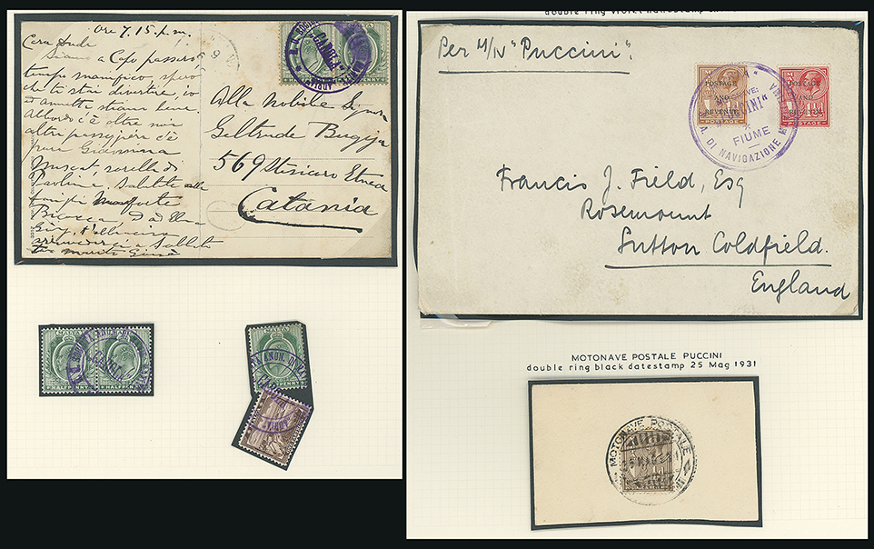 200 c, entire, etc. imageMalta: Maritime Mail: Adria Line: 1911 (June 9) picture postcard to Catania franked ½d. pair tied by double ring “R.U.SOCIETA ANON.DI.NAVIG. MARITT “ADRIA/CAROLA” violet, two others on loose stamps and 1928-29 (ca.) envelopes to England franked 2½d. on 3d. tied by Valletta c.d.s. and large double ring rubber “S.A.DI NAVIGAZIONE MARITTA “ADRIA” MOTONAVE “ROSSINI” FIUME” cachets with additional strike at left and “PAQUEBOT” mark in black, similar examples for the “PUCCINI” (on piece) and “VERDI”. (6 items) (Image1)