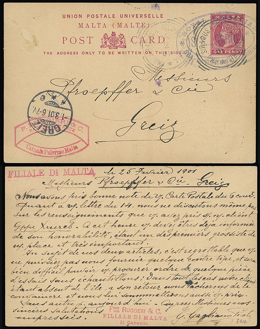199 c, entire, etc. imageMalta: Maritime Mail: Adria Line: 1901 (Feb. 25) 1d. postcard to Germany cancelled with double oval “ROYAL HUNGARIAN/S.S.CAROL/SEA NAVIGATION CO. ADRIA” applied on board and with Syracuse squared circle datestamp applied in transit, unusual. Photo. (Image1)