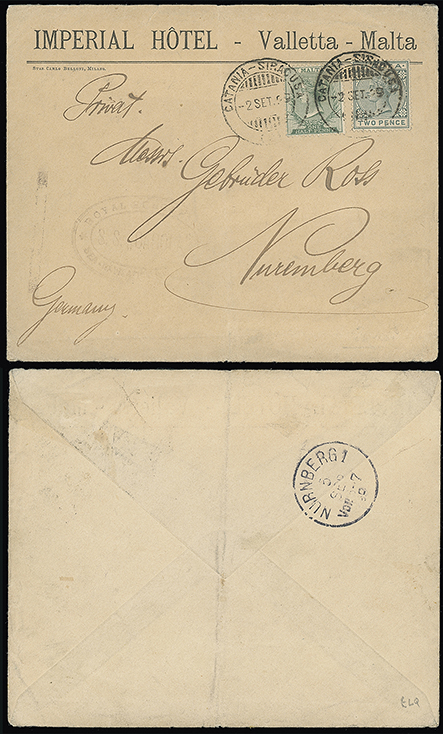 196 c, entire, etc. imageMalta: Maritime Mail: Adria Line: 1898 (Feb. 25) envelope to Nuremberg franked 1/2d, and 2d. cancelled in transit by Catania-Syracuse T.P.O. c.d.s. and with double oval “ROYAL HUNGARIAN/S.S.CAROL/SEA NAVIGATION CO. ADRIA” at lower left applied on board and with Nuremberg arrival c.d.s. on the reverse. Ex Eastgate. Photo. (Image1)