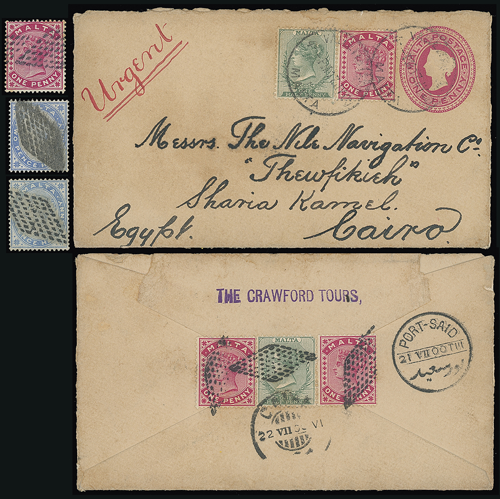 193 c, entire, etc. imageMalta: Maritime Mail: 1900 1d. envelope to Cairo uprated 1/2d. (2, one on the reverse) and 1d. (3, two on the reverse), those on the front tied by Valletta c.d.s. and those on the reverse apparently cancelled on arrival with a retta (dotted rhomboid) cancellation and with Port Said and Cairo c.d.s. also three loose Malta stamps with retta cancellations. (4 items) (Image1)