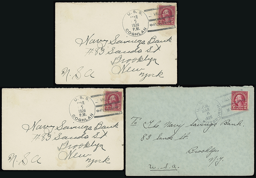 194 c, entire, etc. imageMalta: Maritime Mail: 1926 (Mar.) three envelopes to New York franked U.S.A. 2c. tied by USS Navy “VALLETTA/MALTA” or “MALTA/B.P.” duplex datestamps for the “PITTSBURGH”, “COGHLAN” and “CHARLES AUSBURN”. (Image1)