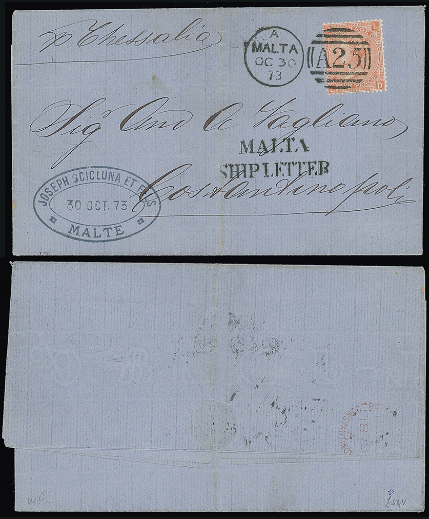 214 c, entire, etc. imageMalta: Malta Ship Letter Marks: 1873 (Oct. 30) wrapper “p Chessalia” to Constantinople franked 1872 4d. plate 13 tied by “A25” duplex with “MALTA/SHIP LETTER” mark in black and (British P.O. in) Constantinople c.d.s. on the reverse, fine. Photo. (Image1)