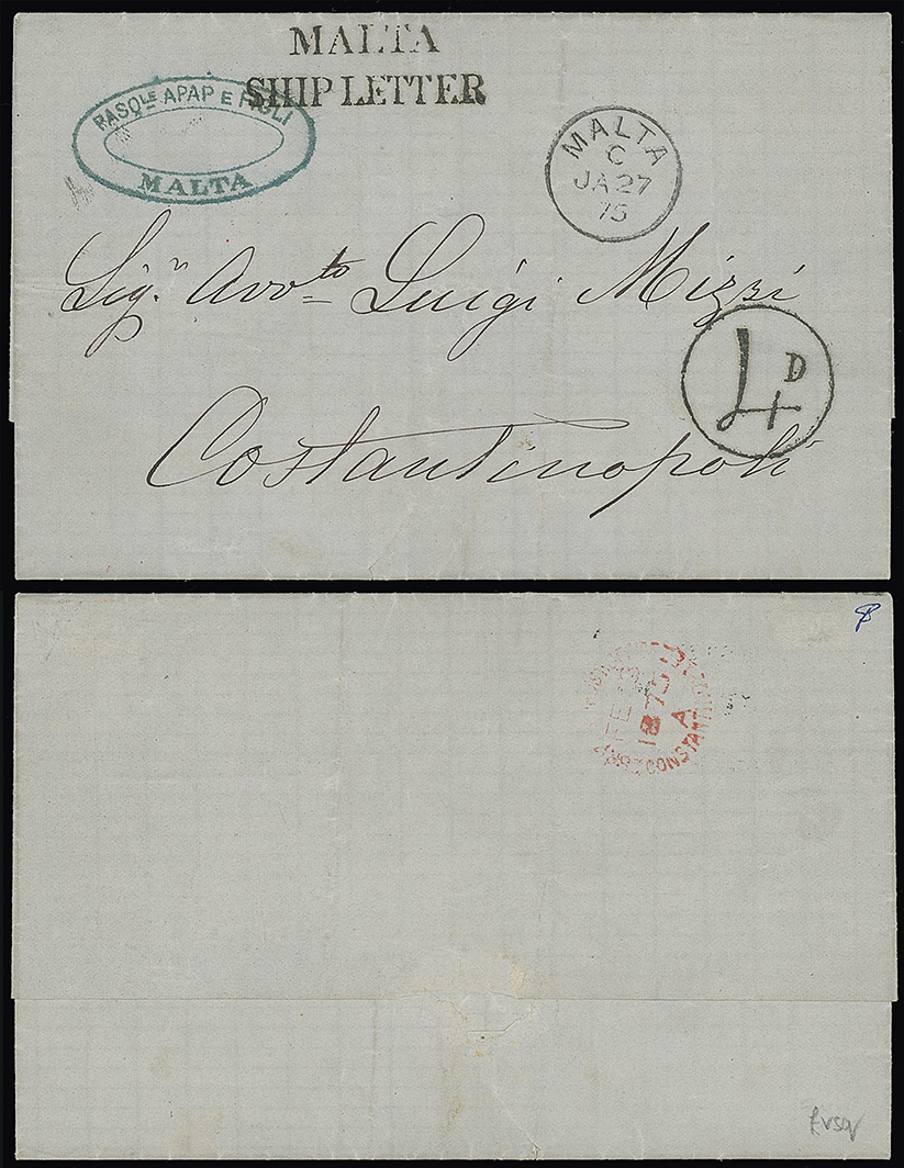 215 c, entire, etc. imageMalta: Malta Ship Letter Marks: 1875 (Jan. 27) unpaid entire letter to Constantinople with “MALTA” c.d.s., “MALTA/SHIP LETTER” mark in black and circular “4D” postage due mark and with (British P.O. in) Constantinople c.d.s. on the reverse, fine. Ex Coates. Photo. (Image1)