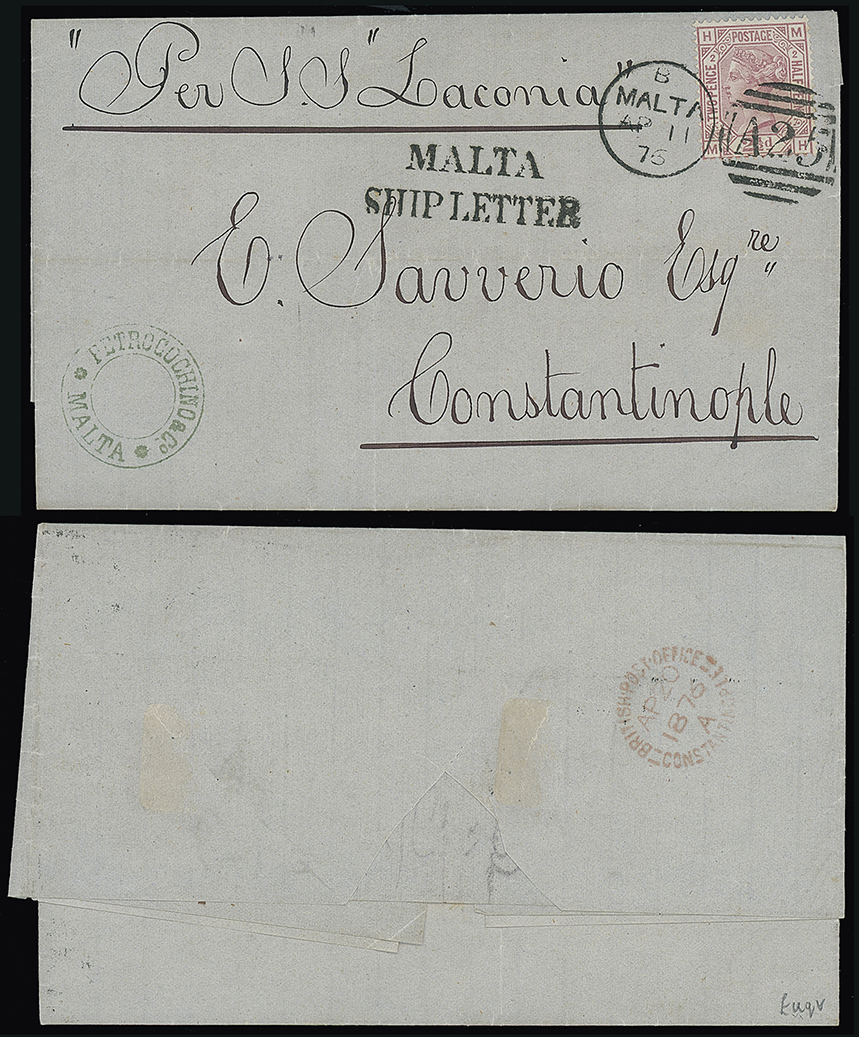 216 c, entire, etc. imageMalta: Malta Ship Letter Marks: 1876 (Apr. 11) entire letter “Per S.S.Laconia” to Constantinople franked 21/2d. plate 2 tied by “A25” duplex, “MALTA/SHIP LETTER” mark in black and with (British P.O. in) Constantinople c.d.s. on the reverse, fine. Photo. (Image1)