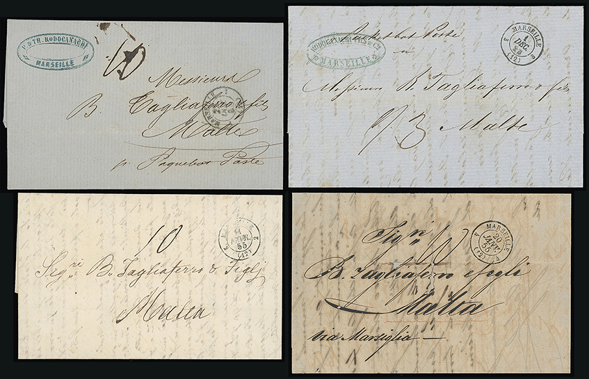207 c, entire, etc. imageMalta: Maritime Mail: Marseille Packet Letter: Selection with 1854 (Oct. 21) and 1855 (Feb. 11) entires to Malta from Marseille with “1/MARSEILLES/1” or “2/MARSEILLES/2” c.d.s. each rated “10”(d), 1853 (Dec. 1) entire letter to Malta from Marseille rated “1/3”(d) and with “3/MARSEILLE/3” c.d.s. and 1855 (Jan. 5) entire letter to Malta from Odessa rated “10”(d) with “4/MARSEILLE/4” c.d.s. (4 items) (Image1)