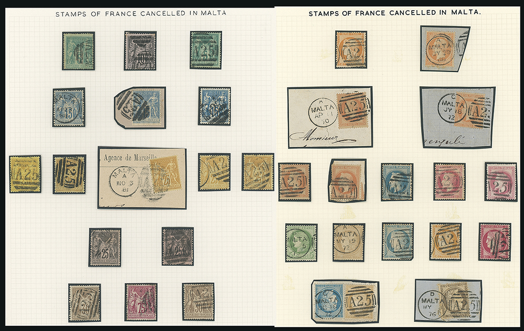 203 c, entire, etc. imageMalta: Maritime Mail: France: Selection with both Napoleon and Ceres perforated issues to 80c. (several tied to pieces) and Peace & Commerce issues incl. 5c., 10c., 15c. (3, one on a piece), 25c. (7, one on a dated piece), 30c. (2) and 75c., all with “A25” duplexes, upright oval or barred circular cancellations. (33) (Image1)
