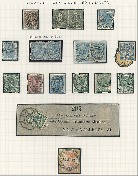 204 c, entire, etc. imageMalta: Maritime Mail: Italy: Selection of Italian stamps to 1924, values from 1c. to 25c. with a range of Maltese cancellations incl. “A25” duplexes and upright oval bars, circular Maltese Cross cancellations (one on a reduced address wrapper to Valletta), Malta thimble c.d.s. and framed “MALTA/MB” date stamp. Ex Orme, Pasti and Coates, fine. (18) (Image1)