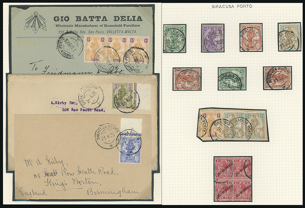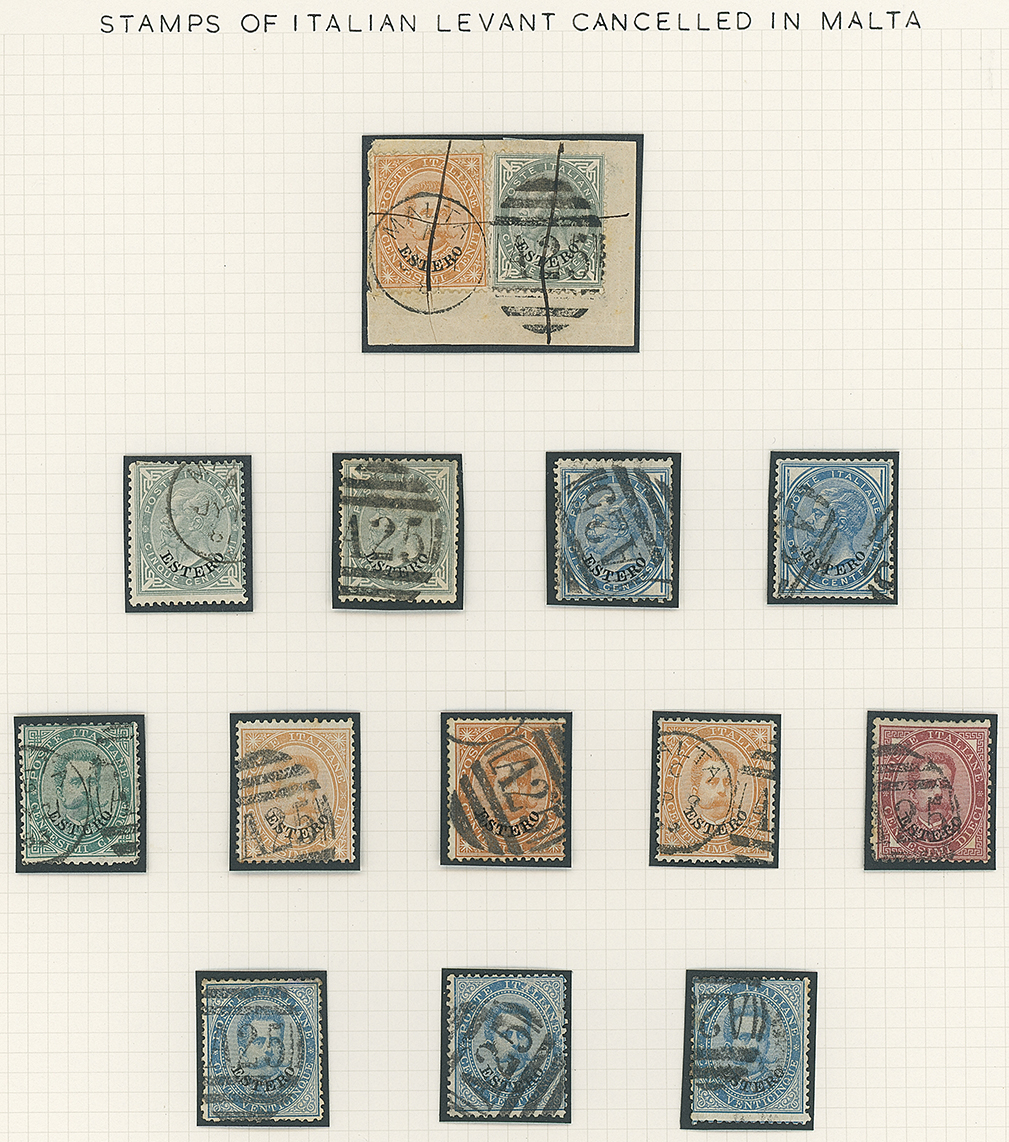 205 c, entire, etc. imageMalta: Maritime Mail: Italian Levant: Selection of values to 50c. (two on a piece) with Maltese cancellations of “A25” duplexes and upright oval bars. (14) (Image1)