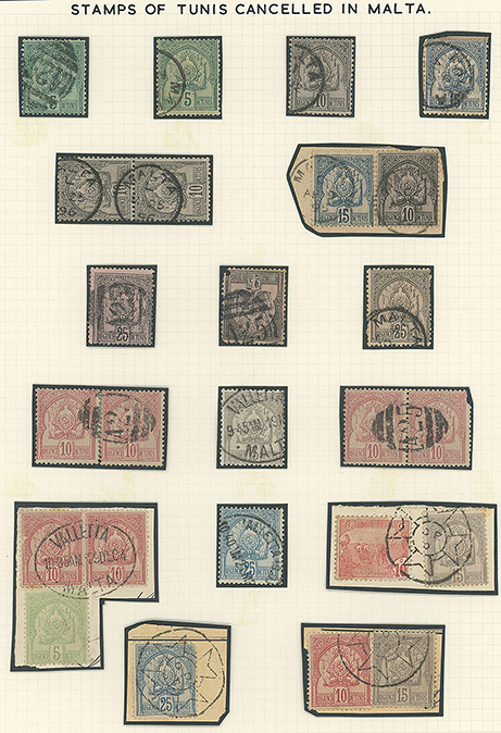 211 c, entire, etc. imageMalta: Maritime Mail: Tunisia: Selection of values to 85c. (incl. on a five pieces) with Maltese cancellations of “A25” duplexes and upright oval bars, circular Maltese Cross cancellations, Valletta oval datestamp etc. (25) (Image1)