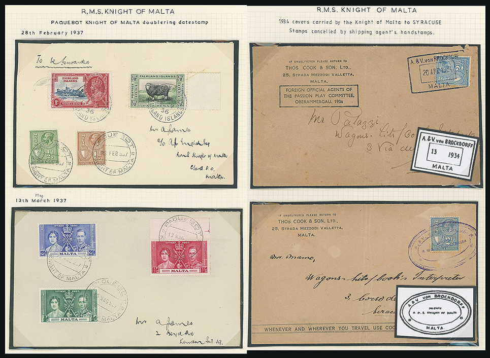 206 c, entire, etc. imageMalta: Maritime Mail: Knight of Malta: Selection incl. 1934 envelopes to England with double ring “PAQUEBOT/KNIGHT OF MALTA”, 1934 envelopes to Italy franked 21/2d. tied by straight line “R.M.S.KNIGHT OF MALTA” and additionally tied by double ring “CASSAR COY LTD/KNIGHT OF MALTA/MALTA” cachet or a shipping agent’s cachet and two further examples carried by the “Knight Of Malta” with rectangular or oval shipping agent’s cachet and a few others, one in combination Falkland Islands franking also a picture postcard of the vessel. (12 items) (Image1)