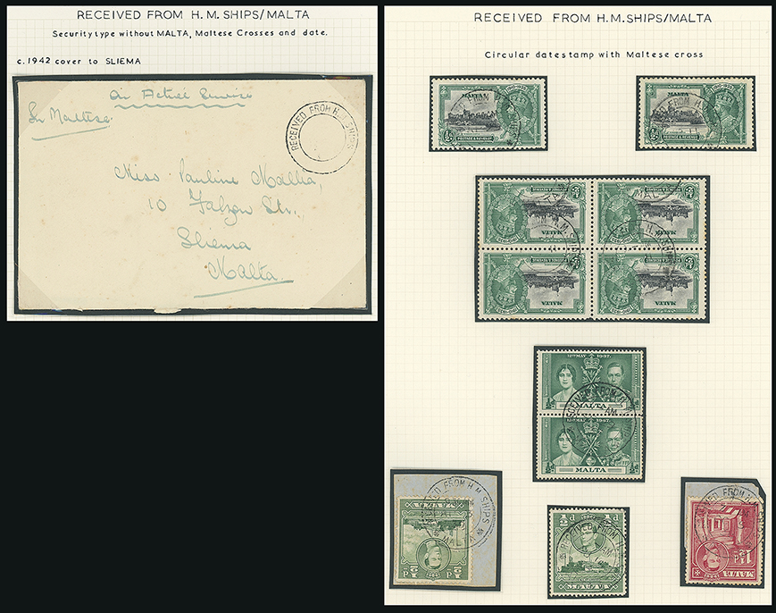 208 c, entire, etc. imageMalta: Maritime Mail: Received From H.M. Ships: Selection incl. 1934 envelope to Malta franked 1/2d. (3), 1938 envelope to France franked 1/2d. pair and 1d. and 1939 envelope to Alexandria franked G.B. 11/2d. and redirected to Malta, 1951 envelope to Sliema franked G.B. 1/2d. and 2d. all with “RECEIVED FROM H.M.SHIPS/MALTA” c.d.s. and a selection of K.G.V and K.G.VI issues with the same cancellations, a few on piece also a 1942 (ca.) unfranked active service envelope to Sliema with the same cancellation showing “MALTA” removed. (21 items) (Image1)