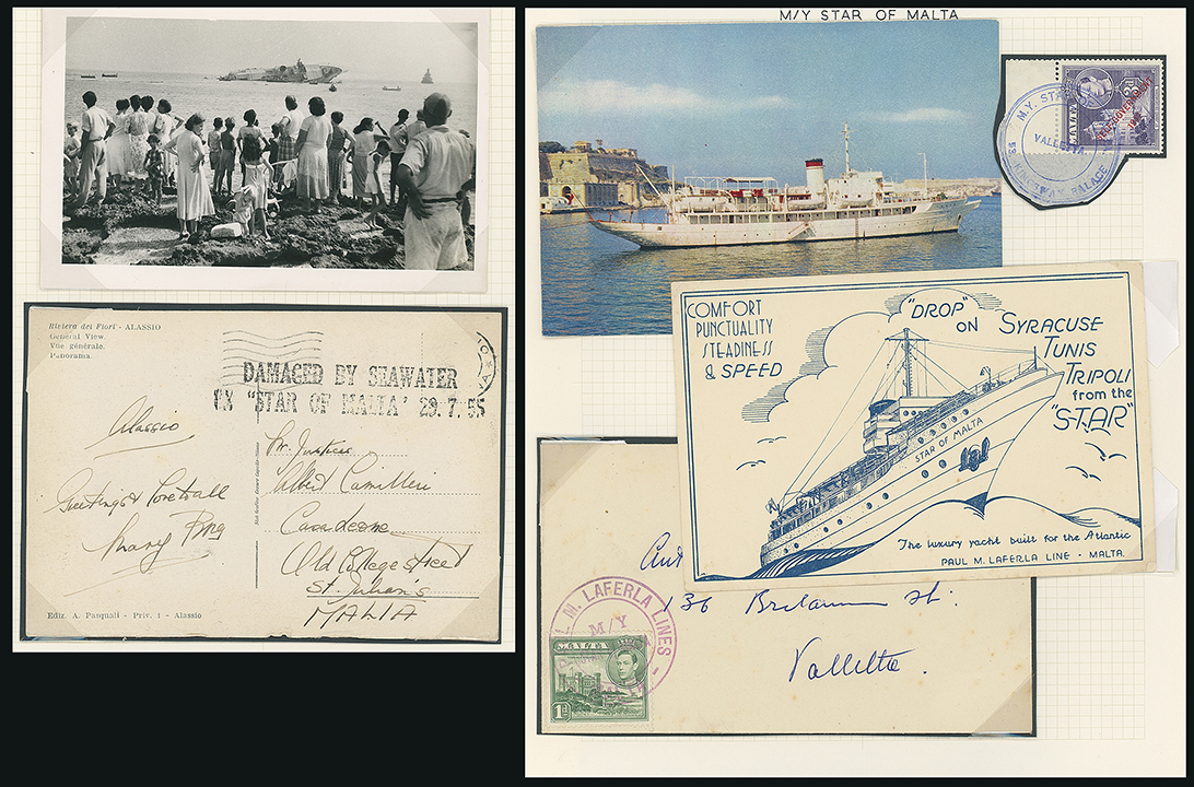 209 c, entire, etc. imageMalta: Maritime Mail: Star of Malta: Selection incl. 1955 (July) picture postcards to Sliema or St Julians from Italy with frankings washed away and with “DAMAGED BY SEAWATER/EX “STAR OF MALTA” 29.7.55” marks and contemporary photos of the stricken ship, also postcards of the ship prior and one advertising its services and K.G.VI 1d. or 3d. with the ships cachets tied to piece or cover. (8 items) (Image1)