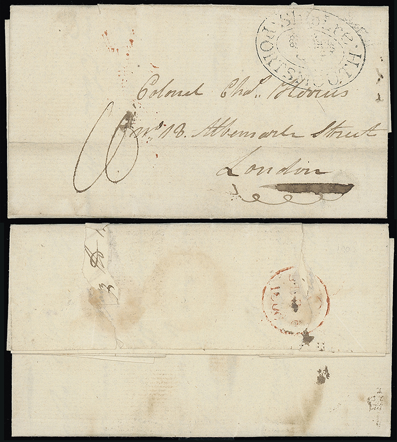 219 c, entire, etc. imageMalta: Great Britain Ship Letter Marks: 1800 (Sept. 8) entire letter to London datelined at St Julian’s with black double oval “Ship Lre/(crown)/ PORTSMOUTH” mark, London c.d.s. on the reverse and rated “10”(d). Sent by Captain J. Herries “...the strong fortress of Valletta surrendered to us (British Forces).... after a blocade (sic) of two years. They (the French Forces) are to be sent immediately to France as prisoners of war....the Maltese are such savages & dislike the French so much that their greatest pleasure would be to make a good dinner of some of them....”. Important insight into the British victory. Photo. (Image1)