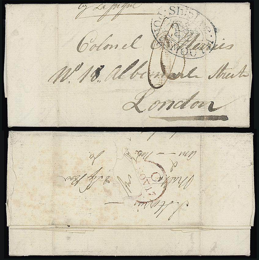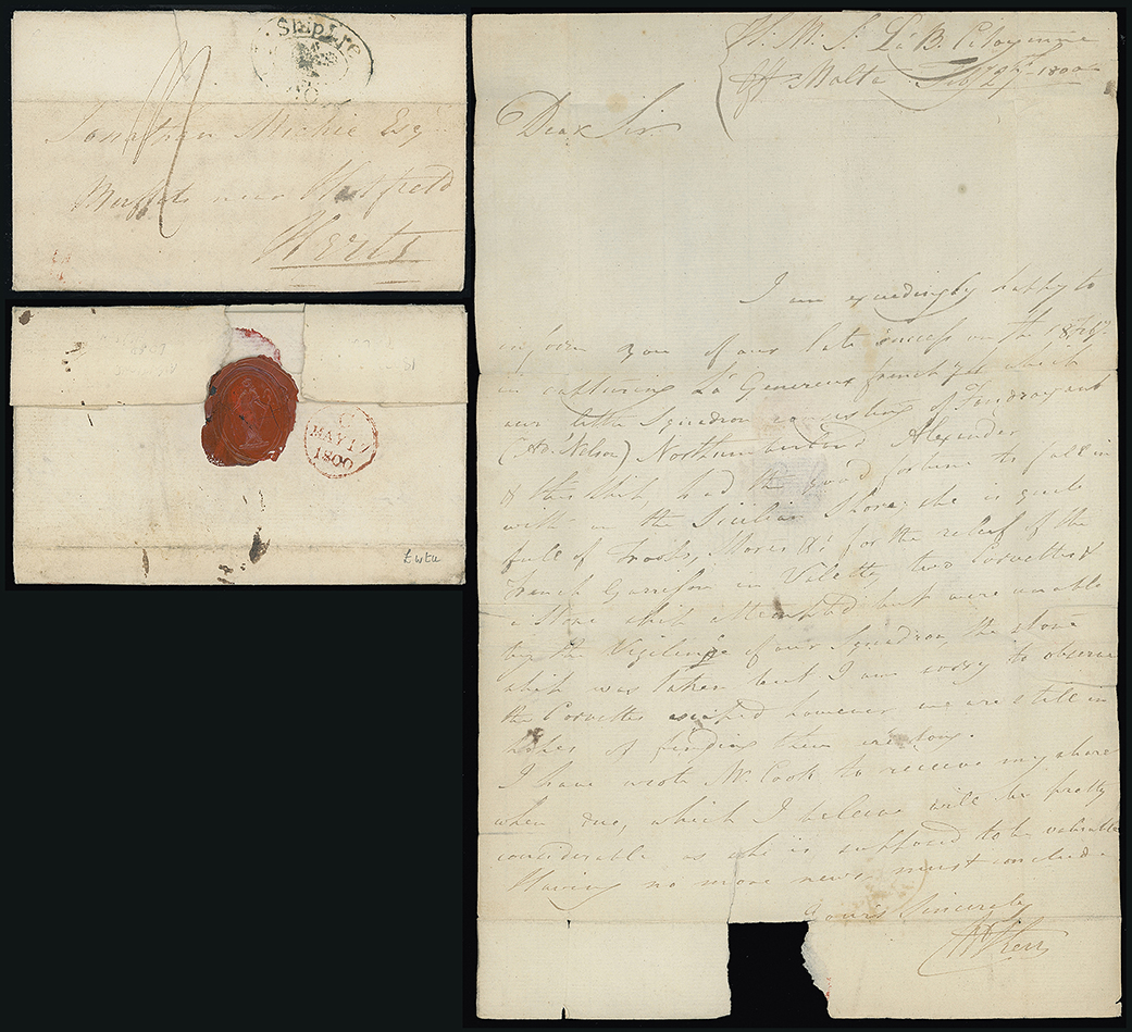218 c, entire, etc. imageMalta: Great Britain Ship Letter Marks: 1800 (Feb. 27) entire letter (closed tear) to England rated “11”(d) on arrival and with double oval “Ship Lre/(crown)/PORTSMOUTH” mark and London transit datestamp on reverse. Written by John Kerr on board “H.M.S Bonne Citoyenne off Malta”, “...our late success on 18 Feby in capturing Le Genereuex 74 (French gun ship from Toulon en route to the French Garrison at Malta) which our little squadron consisting of Foudroyant (Admiral Nelson), Northumberland, Alexander & this ship had the good fortune to fall in with on the Sicilian Shore....I have wrote Mr Cook to receive my share (prize money) when due, which I believe will be pretty considerable as she is supposed to be valuable”. Exceptional insight into the Maltese connection with the Napoleonic Wars. Photo. (Image1)