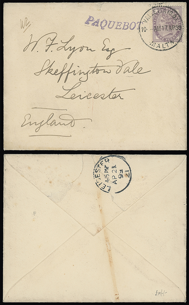 217 c, entire, etc. imageMalta: Malta Ship Letter Marks: Selection incl. 1899 envelope to Leicester franked G.B. 1d. lilac tied by Valletta c.d.s. with purple “PAQUEBOT” (33mm) alongside, 1929 envelope to Valletta franked Malta 1/2d. tied by “PAQUEBOT” mark in black, 1931 picture postcard to Bath franked G.B. 11/2d. tied by double ring “PAQUEBOT/MALTA” c.d.s., 1932 envelope to Bath franked 11/2d. tied by London Paquebot machine cancellation, 1933 envelope to England franked G.B. 11/2d. tied by double ring “PAQUEBOT/MALTA” (with Maltese Crosses) c.d.s., etc. (15) (Image1)