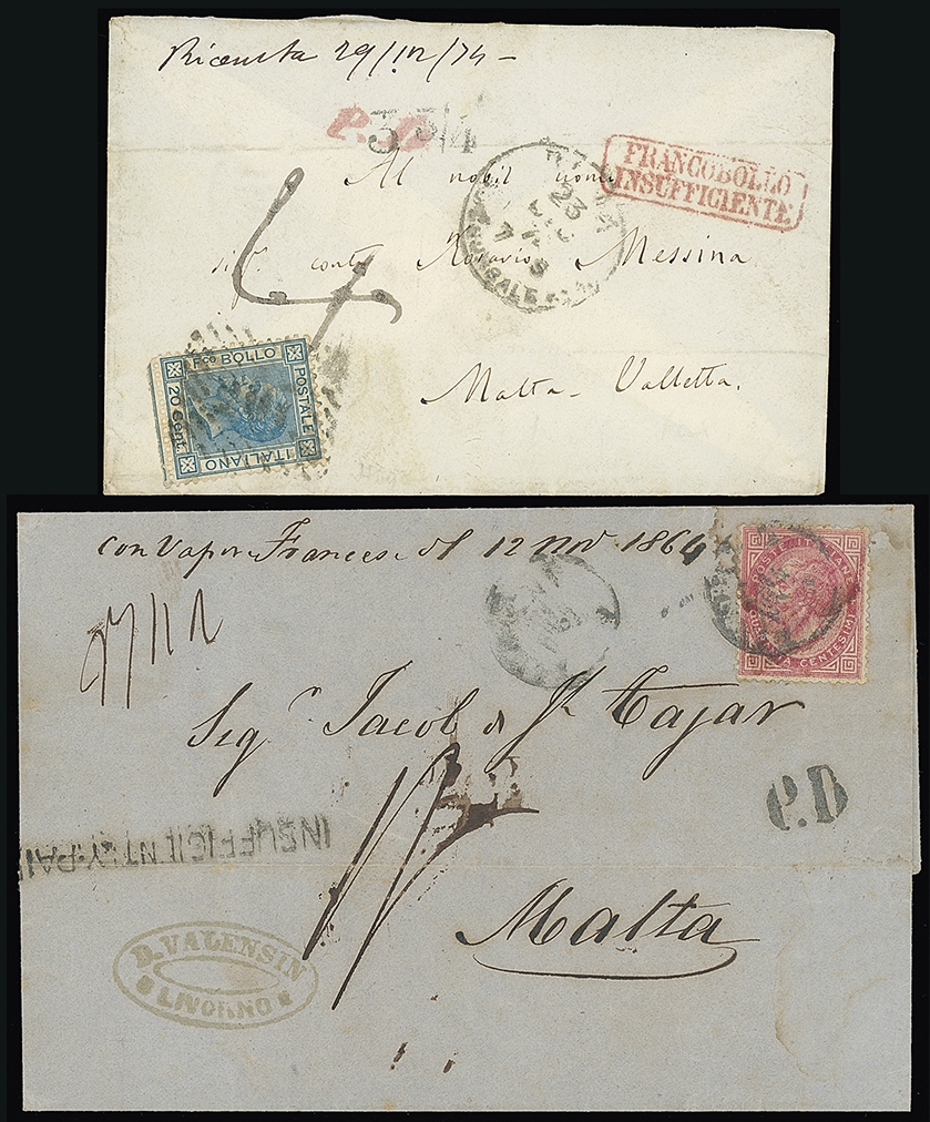 327 c, entire, etc. imageMalta: Straight Line Postage Due Marks on Inward Mail: 1864 (Nov. 11) wrapper to Malta franked Italy 40c. tied by Livorno c.d.s. “P.D” mark apparently applied incorrectly, “INSUFFICIENTLY PAID” mark at left and rated “1/-” due and 1874 (Dec. 23) envelope to Valletta from Rome franked Italy 20c. with framed “FRANCOBOLLO/INSUFFICIENTE” with “P.D.” mark overstruck by “33/4” accountancy mark and rated “4”(d) due. (2 items) (Image1)