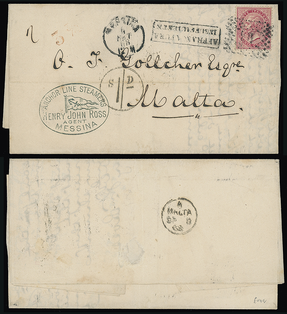330 c, entire, etc. imageMalta: Straight Line Postage Due Marks on Inward Mail: 1868 (Sept. 6) entire letter to Malta from Messina franked Italy 40c. tied by dotted numeral cancellation with framed “AFFRANCATURA/INSUFFICIENTE”, “33/4” accountancy mark, circular “s1/-D” charge mark and a superb Anchor Line Steamers Agents sender’s cachet at lower left, rare combination of marks. Photo. (Image1)