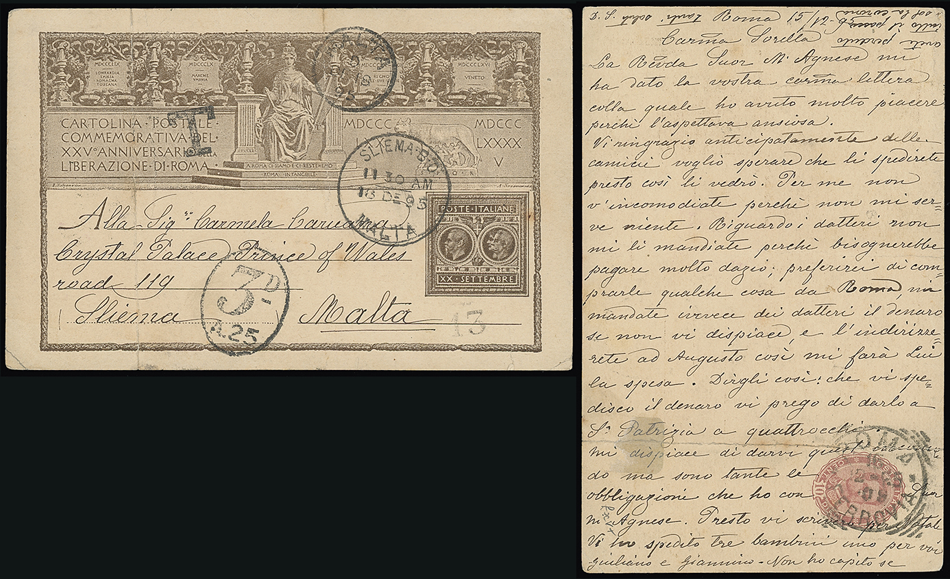 336 c, entire, etc. imageMalta: Straight Line Postage Due Marks on Inward Mail: 1895 (Dec. 15) underpaid Italy 5c. postcard (creased) to Sliema with Malta and Sliema c.d.s., serif “T” and scarce oval “3D/A.25” mark. Ex Coates. Photo. (Image1)
