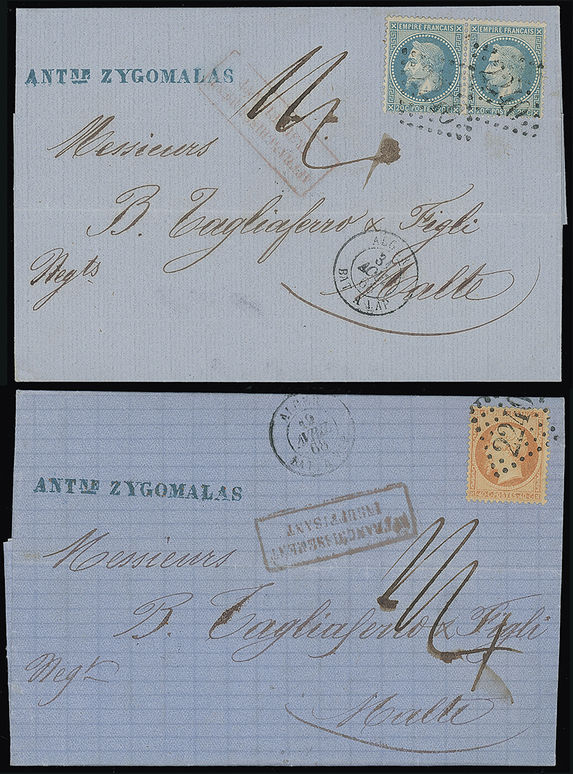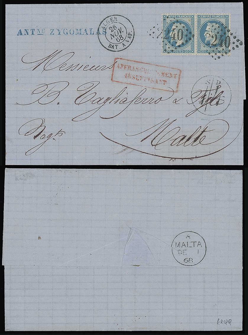 329 c, entire, etc. imageMalta: Straight Line Postage Due Marks on Inward Mail: 1868 (Apr. 19, Aug. 31) entire letters to the same addressee in Malta from Algiers franked France pair 20c. or 40c. and all tied by “2240” (Marseille) dotted rhomboid cancellations enroute with “ALGER/BAT. A VAP.” datestamps and each with framed “AFFRANCHISSEMENT/INSUFFISANT” marks in red and rated ‘1/4’(d) due in Malta, very fine. (2 items) Photo. (Image1)
