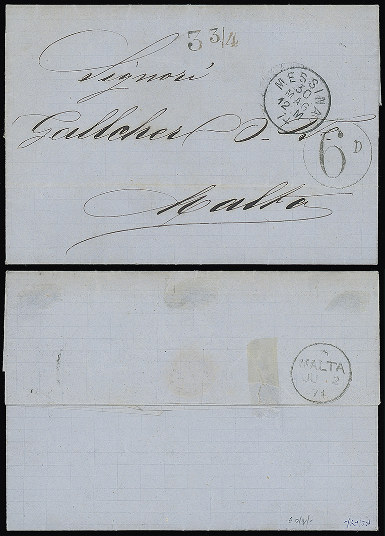333 c, entire, etc. imageMalta: Straight Line Postage Due Marks on Inward Mail: 1874 (May 30) unpaid entire letter to Malta with “MESSINA” c.d.s., “33/4” accountancy mark and circular “6D” postage due mark. Malta arrival c.d.s. on the reverse, very fine. Photo. (Image1)