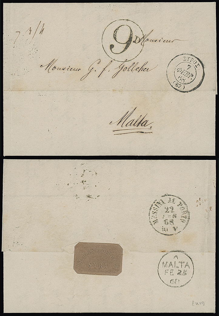 328 c, entire, etc. imageMalta: Straight Line Postage Due Marks on Inward Mail: 1868 (Feb. 18) unpaid entire letter to Malta with “SYRA” (Greece) c.d.s., “73/4” manuscript accountancy mark and circular “9D” postage due mark. Messina and Malta arrival c.d.s’s on the reverse, rare charge mark. Photo. (Image1)