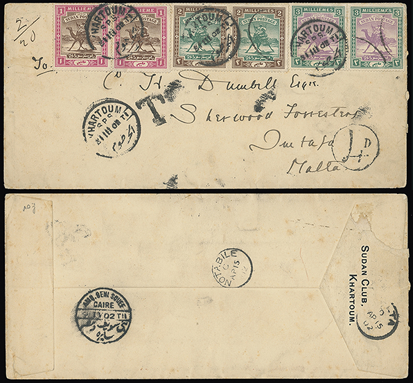 340 c, entire, etc. imageMalta: Straight Line Postage Due Marks on Inward Mail: 1902 (Mar. 31) envelope to Imtarfa franked Sudan pairs of the 1m., 2m. and 3m. tied by Khartoum c.d.s. with bold serif “T” and circular “4D” postage due mark and with Beni Souef-Cairo T.P.O., Malta and Notabile datestamps on the reverse. Photo. (Image1)