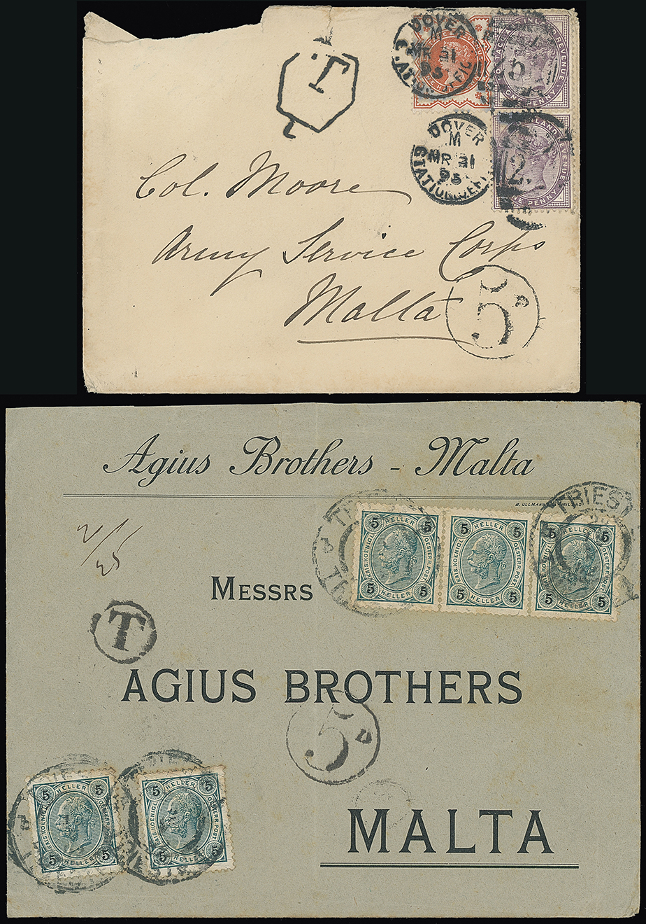 335 c, entire, etc. imageMalta: Straight Line Postage Due Marks on Inward Mail: 1895 (Mar. 21) torn envelope franked G.B. 1d. lilac pair and 1/2d. tied by Dover c.d.s. and with hexagonal “T” mark and 1902 (Dec. 27) printed envelope (with contents) franked Austria 5h. (5) tied by Trieste c.d.s. with circular “T” mark and both with circular “5D” postage due marks applied in Malta. (2 items) (Image1)
