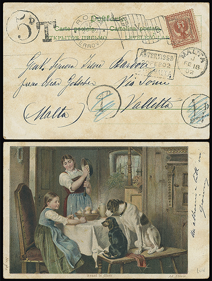 338 c, entire, etc. imageMalta: Straight Line Postage Due Marks on Inward Mail: 1902 (Feb. 2) picture postcard to Valletta franked Italy 2c. tied by Rome machine cancellation with bold serif “T” mark and circular “1D”, “4D” and “5D” postage due marks applied, the former two manuscript deleted and with a Malta arrival c.d.s., framed “ADVERTISED/[(date)/G.P.O. MALTA” mark, unusual example of multiple errors in tax calculations. Ex Said. Photo. (Image1)