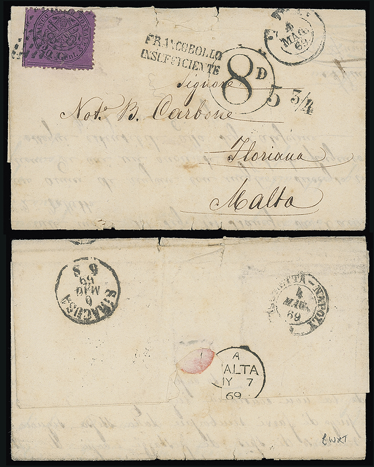332 c, entire, etc. imageMalta: Straight Line Postage Due Marks on Inward Mail: 1869 (May 3) entire letter to Floriana franked Papal States 20c. tied by dotted rhomboid cancellation with Rome c.d.s., “FRANCOBOLLO/INSUFFICIENTE”, “53/4” accountancy and circular “8D” postage due marks. Naples, Syracuse and Malta datestamps on the reverse, scarce. Photo. (Image1)