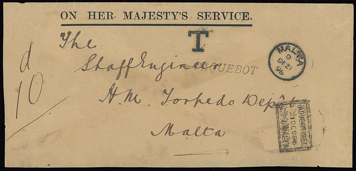 337 c, entire, etc. imageMalta: Straight Line Postage Due Marks on Inward Mail: 1896 (Dec.) O.H.M.S envelope to “H.M.Torpedo Depot” possibly from England, apparently posted on board with “PAQUEBOT” mark, Malta arrival c.d.s., bold serif “T”, manuscript “d10” (double deficiency) and double lined framed “ADVERTISED(date)/G.P.O. MALTA” datestamp. Unusual combination of official, paquebot, taxed and advertised mail, the latter particularly so given where it is addressed. Photo. (Image1)