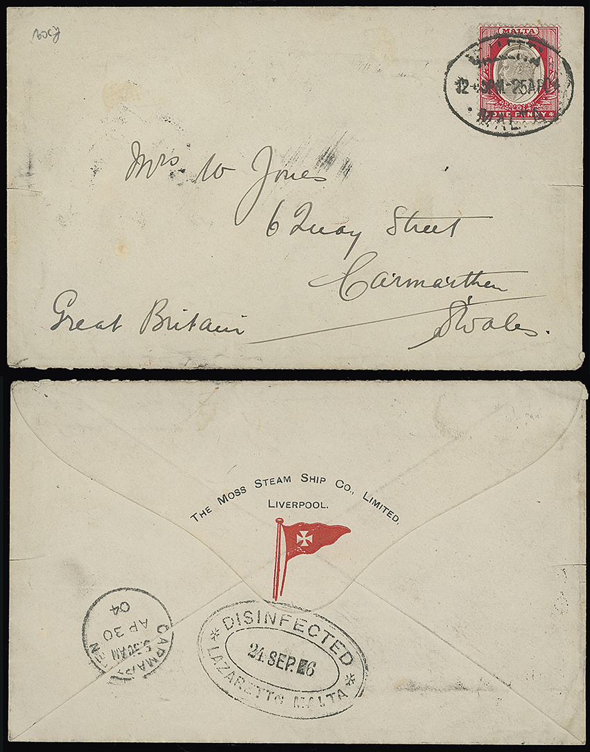 321 c, entire, etc. imageMalta: Disinfected Mail: 1904 (Apr. 25) Moss Steam Ship Co. envelope to Wales franked K.E.VII 1d. tied by Valletta c.d.s., disinfection slits at left and right sides and double oval “DISINFECTED/(date)/*LAZARETTO MALTA*” mark, in black (in this colour in 1903-04 only) and with date error, scarce. Ex Saunders. Photo. (Image1)