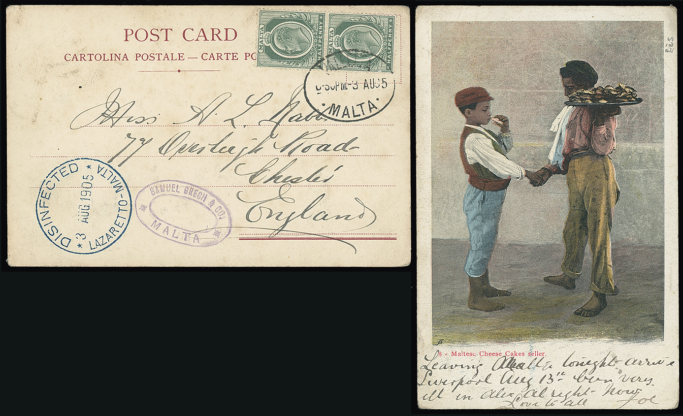 322 c, entire, etc. imageMalta: Disinfected Mail: 1905 (Aug. 3) picture postcard to Chester franked Malta 1/2d. pair tied by Valletta datestamp with superb “DISINFECTED/LAZARETTO-MALTA” c.d.s., in blue. (Image1)