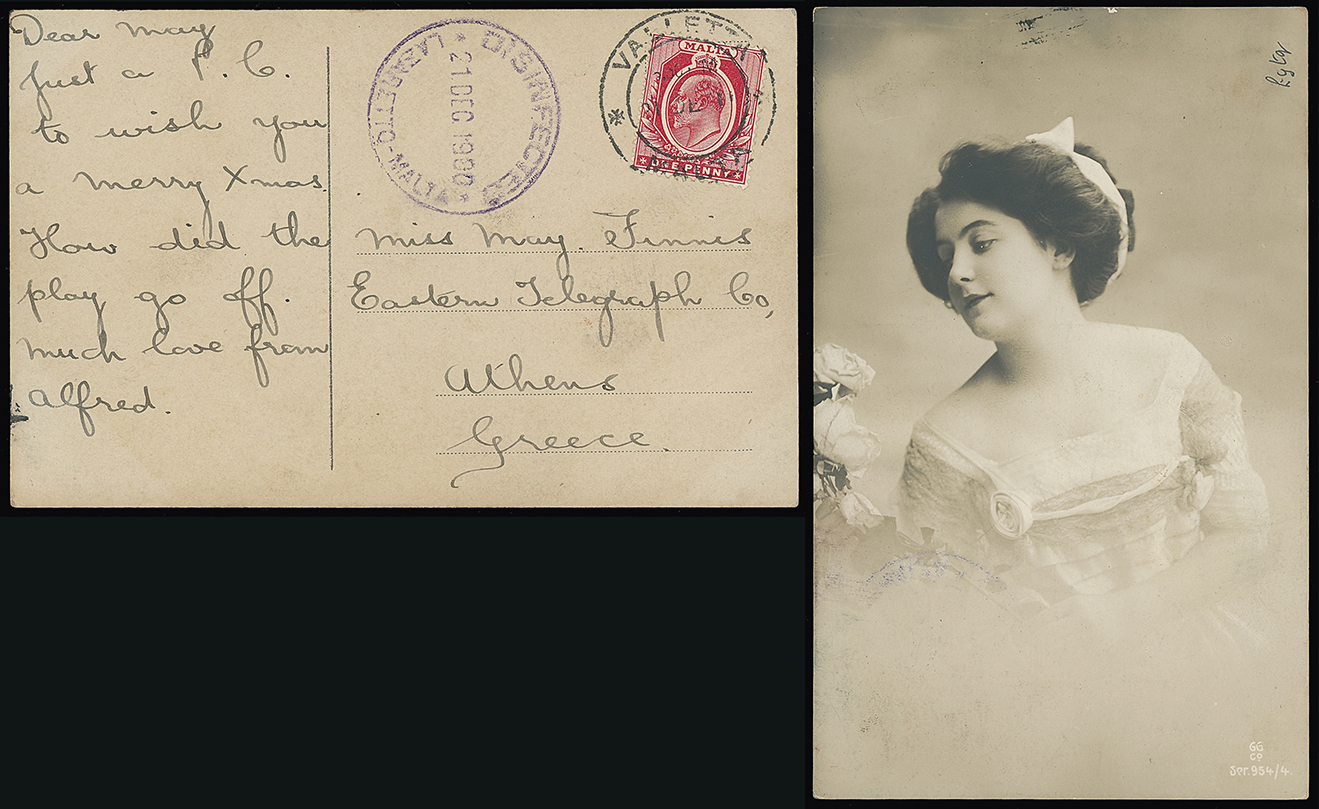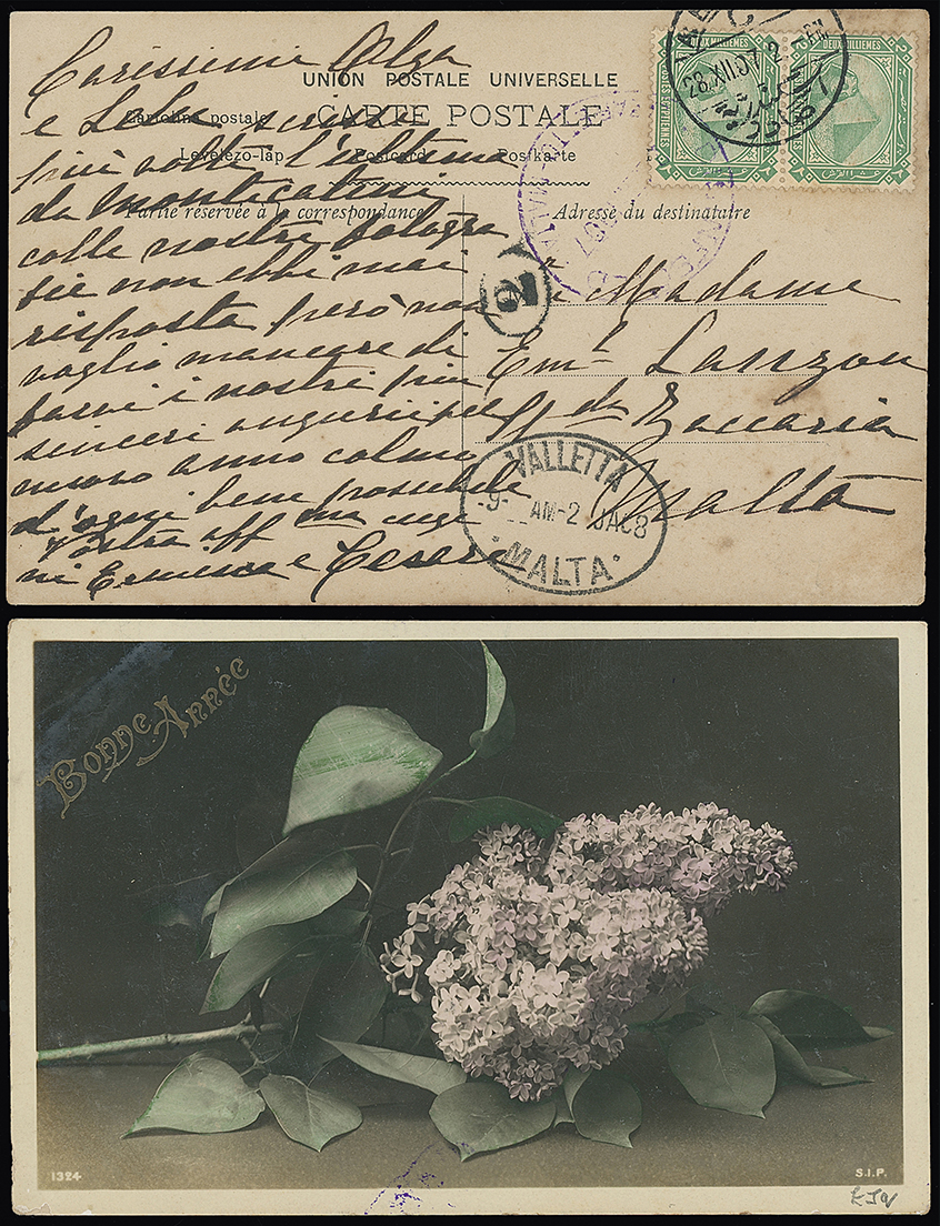 325 c, entire, etc. imageMalta: Disinfected Mail: 1907 (Dec. 28) picture postcard to Malta franked Egypt 2m. with “DISINFECTED/LAZARETTO-MALTA” c.d.s., in purple and oval Valletta arrival datestamp. Photo. (Image1)